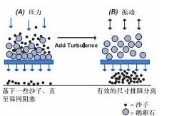 (A)對混合物施加直接的壓力,使得底部砂粒落下;在篩網表麵形成一個鵝卵石層,阻礙頂部砂粒向篩網方向移動並通過篩網。(B)振動篩網,破壞位於混合物底部的積聚鵝卵石層,使完全分離得以進行;切向流過濾中,進科流的錯流動力學作用,就相當於此例中的振動。