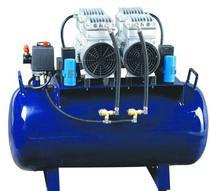 無油空氣壓縮機是屬於微型往複活塞式壓縮機,電機單軸驅動對稱分布曲柄搖杆機械結構,主運動付為活塞環,副運動付為鋁合金圓柱麵,運動付之間由活塞環自潤滑而不添加任何潤滑劑。壓縮機通過曲柄搖杆的往複運動使圓柱麵氣缸的容積發生周期性變化,電機運轉一周氣缸容積有兩次方向相反的變化。當正方向是氣缸容積擴展方向時,氣缸容積為真空,大氣壓大於氣缸內氣壓,空氣通過進氣閥門進入氣缸,此時為吸氣過程:當反方向是容積縮小方向時,進入氣缸內的氣體受到壓縮,容積內的壓力迅速增加,當大於大氣壓力時,排氣閥門被打開,此時為排氣過程。單軸雙缸的結構布置使壓縮機氣體流量在額定轉速一定時為單缸的兩倍,並使得單缸壓縮機產生的振動噪音得到很好的解決,整體結構更加緊湊。