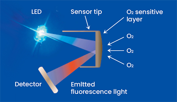 光學溶氧電極采用的是基於物理學中特定物質對活性熒光的猝熄原理。傳感器的設計是通過一個發光二極管(LED)發出的藍光照射在熒光帽內表麵的熒光物質上,特定的發光體被藍光激發後會發生冷光現象(紅光),通過檢測紅光與藍光之間的相位差,並與內部標定值比對,便可計算出氧濃度最後再經過溫度和氣壓自動補償輸出最終值。