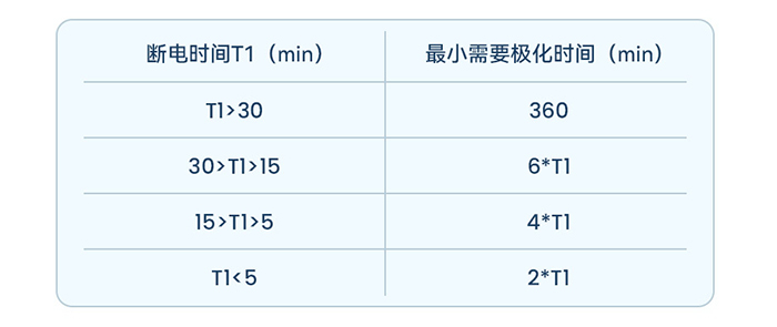 ③ 變送器斷電或電極與電纜線斷開,最小極化時間見下表。