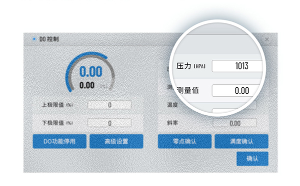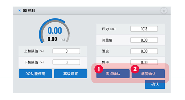 將電極接通電源後,先放入無氧環境中,待讀數穩定後點擊“零點確認”,再將電極放入純氧環境中,待讀數穩定後點擊“滿度確認”,彈出窗口“DO電極OK”即表示校準完成。