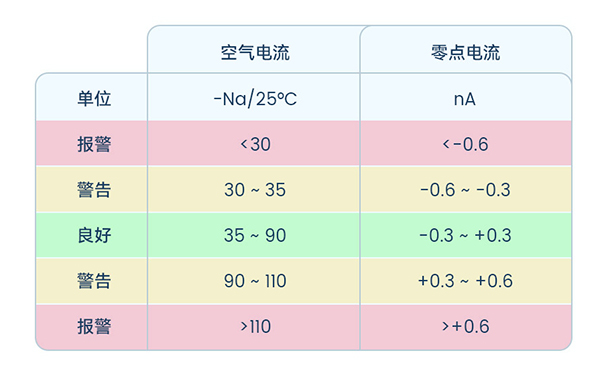 以空氣為校準介質進行校準後,參考極譜式溶氧電極電流信號表中空氣電流的標準,判斷DO電極的斜率是否正常。